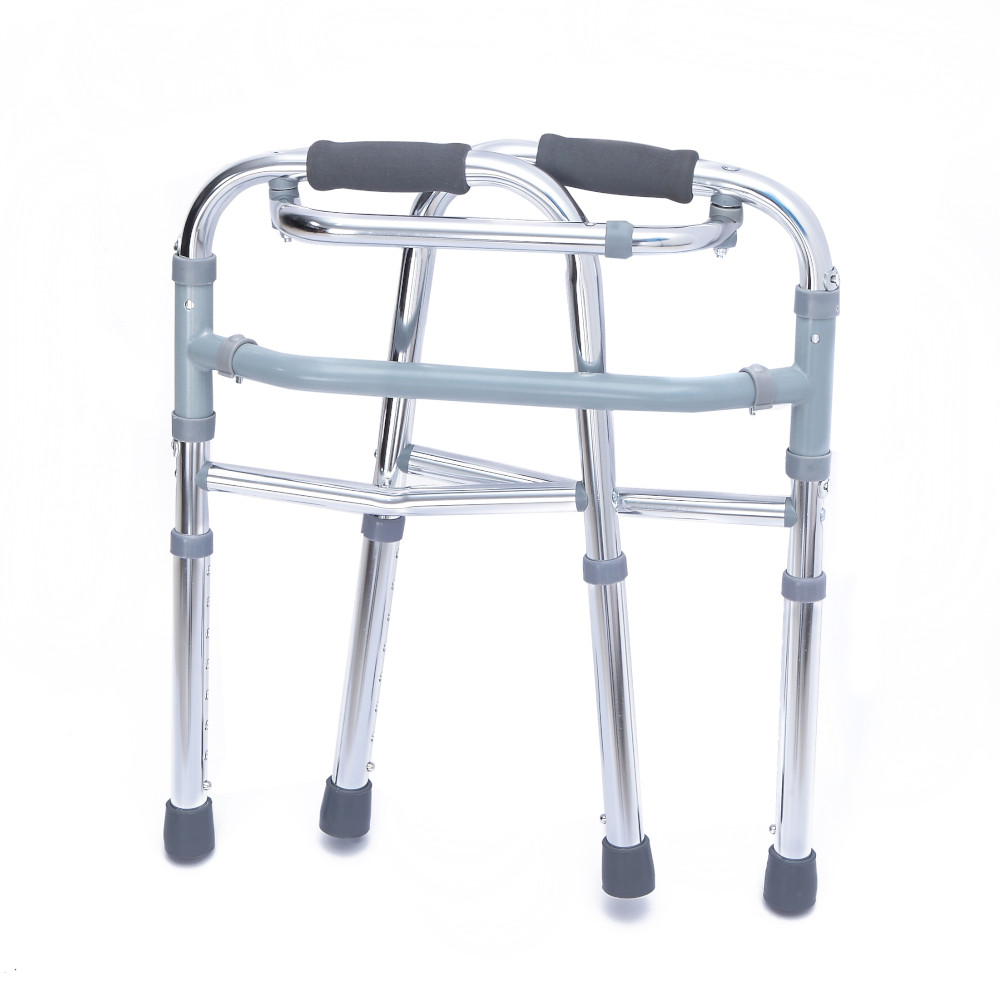 Este andador plegable de aluminio ofrece mucha estabilidad al caminar. Deben utilizarse ambos brazos para usarlo, ya que se debe levantar y mover a cada paso.