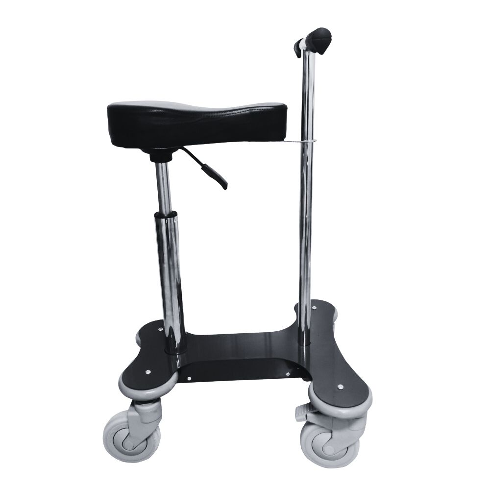 Con asiento regulable en altura y equipado con cuatro ruedas.