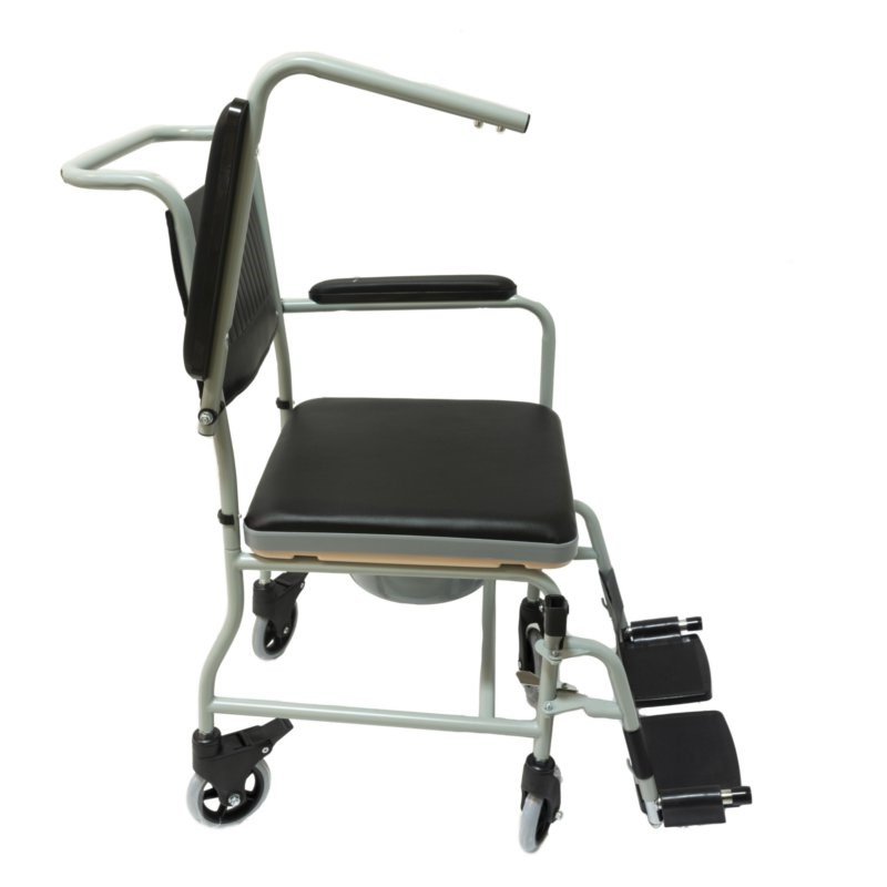 Esta silla con inodoro y ruedas acolchada es un producto de apoyo para el aseo. Puede utilizarse directamente sobre el inodoro haciendo funciones de elevador de WC. Asimismo, al disponer de cubeta, se puede usar en cualquier parte del hogar.