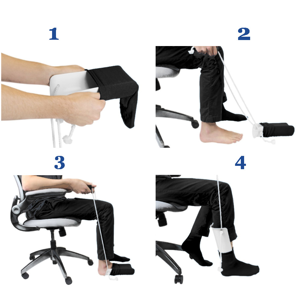 Dispone de dos clips para sujetar los calcetines. Se dobla para poder poner fácilmente la media en el pone-medias y facilitar su colocación alrededor del pie. Se sostiene por dos cintas y al estirar, el calcetín o la media se desliza por la pierna.