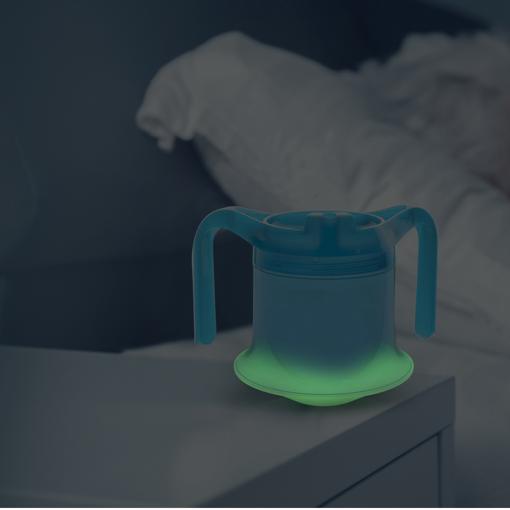 Este vaso antiderrame luminoso tiene tapa y boquilla evita que se derrame líquido sobre el paciente o usuario. Al mismo tiempo permite controlar la cantidad de líquido ingerido y se le pueden acoplar pajitas