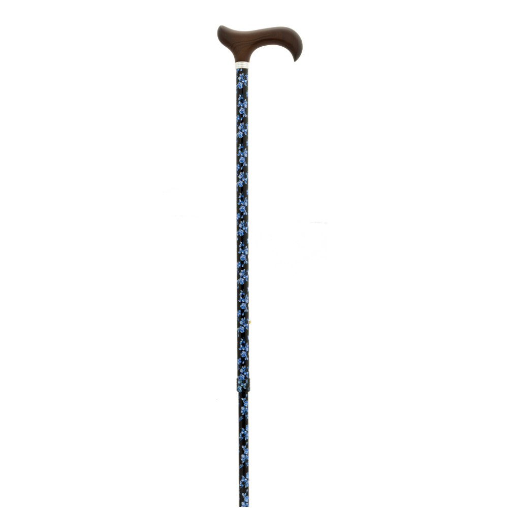 Esta muletilla extensible está fabricada en aluminio con fondo negro y estampado de flores de color azul y la empuñadura es de madera.
