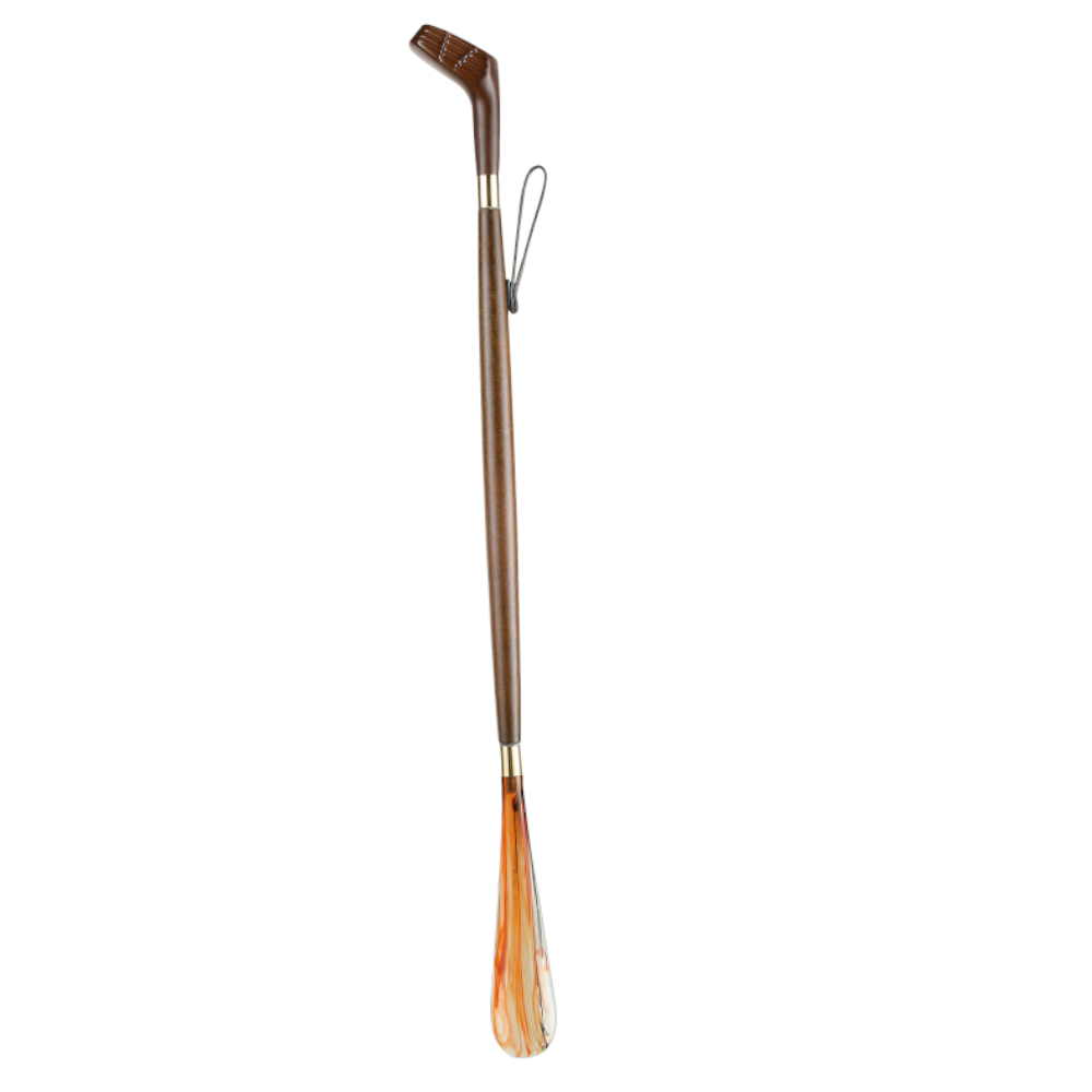 Este calzador está fabricado en madera de haya barnizada. El puño en forma de pala de golf de color marróm, palo de haya marron y pala de acetato de celulosa. Anillas de latón en las uniones.