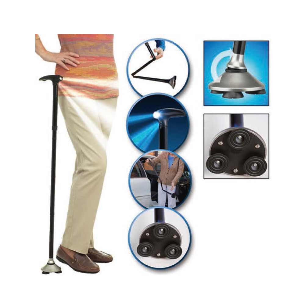 Bastón con luz plegable con base de 9 cm. Este bastón ayuda al usuario a guiarse en zonas con poca luminosidad, al mismo tiempo que permite ser visto. Sus características principales son las siguientes: