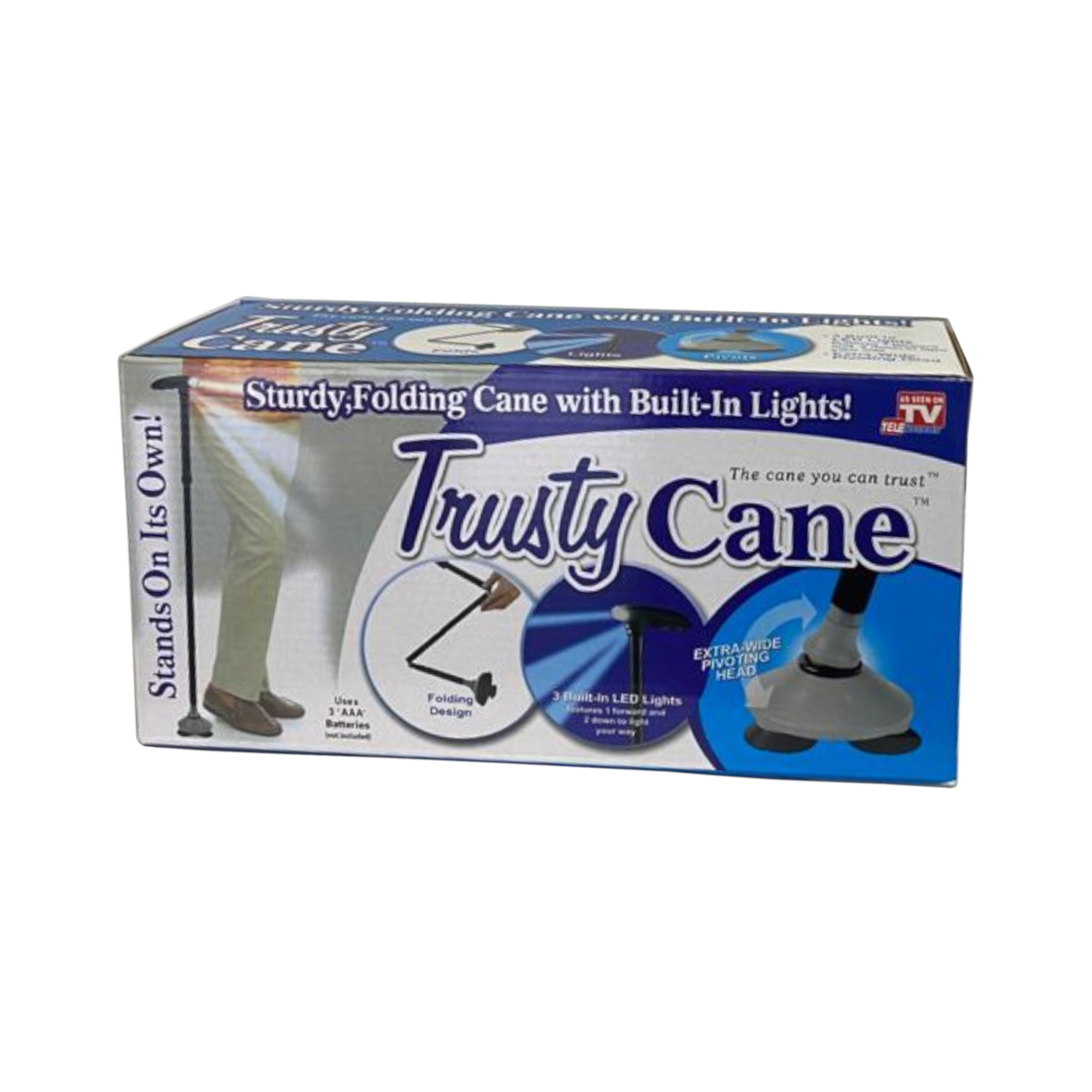 Para reemplazar las baterías, use un destornillador de cabeza Philips para desatornillar el compartimiento de las baterías debajo del mango Trusty Cane. Retire las baterías agotadas y deséchelas adecuadamente. Con 3 pilas AAA, alinee + y – como se indica; de lo contrario, las luces no funcionarán. Vuelva a colocar y apriete el tornillo en la puerta de la batería. Inspeccione regularmente el bastón en busca de signos de desgaste, incluido cualquier deshilachado en el cordón elástico o desgaste en las patas de goma. Si ve signos de desgaste, deje de usarlo inmediatamente.