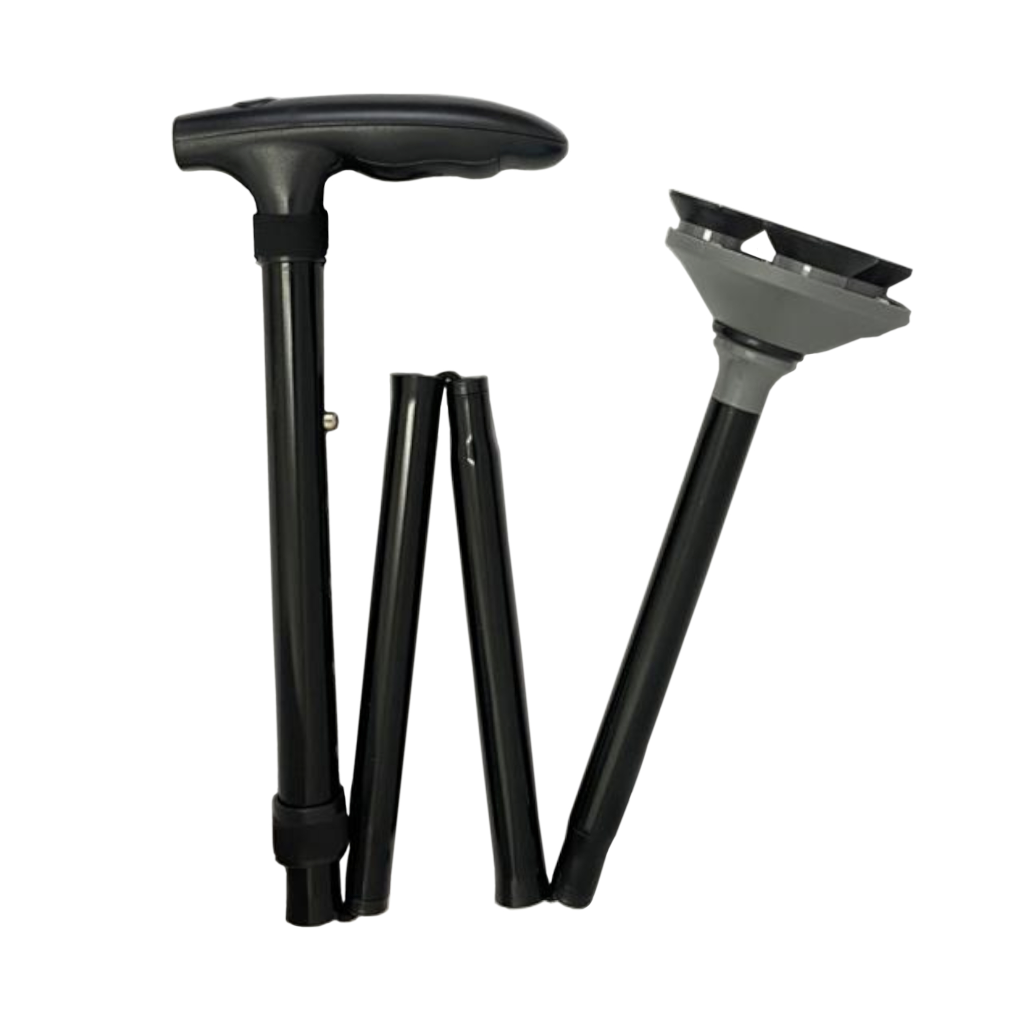 Su Trusty Cane se puede plegar fácilmente en un tamaño de viaje conveniente al separar los 4 segmentos individuales del eje entre sí. Sostenga cada conjunto de segmentos del eje cerca de la junta y sepárelos. Los segmentos individuales del eje se plegarán perfectamente.