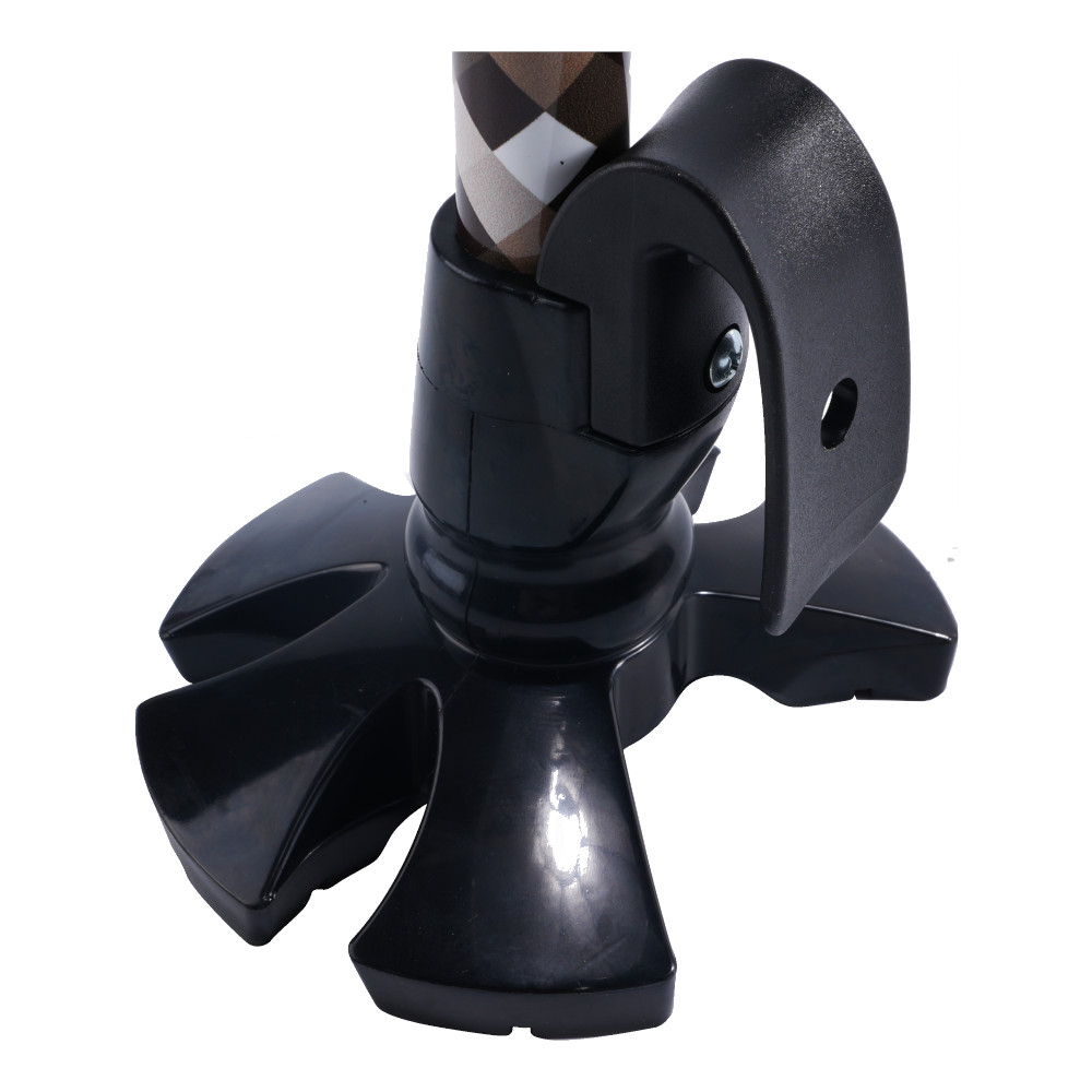 La base mide 12 cm de diámetro, proporcionando un apoyo más seguro, además de permitir que el bastón se mantenga en pie cuando no se usa.