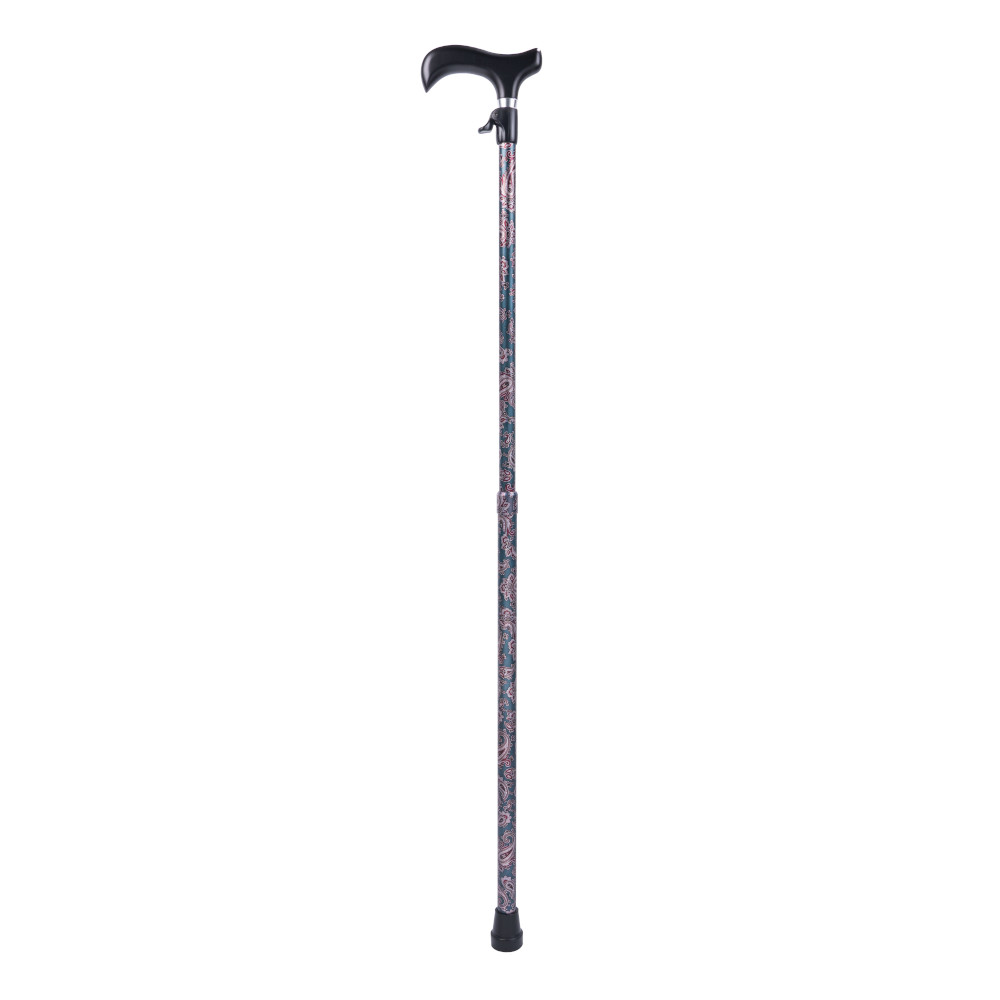 Esta muletilla stand up extensible está fabricada en aluminio. El tubo es es de diseño de cachemir en fondo verde, y dispone de un botón o gatillo para poder regularla a la altura necesaria.